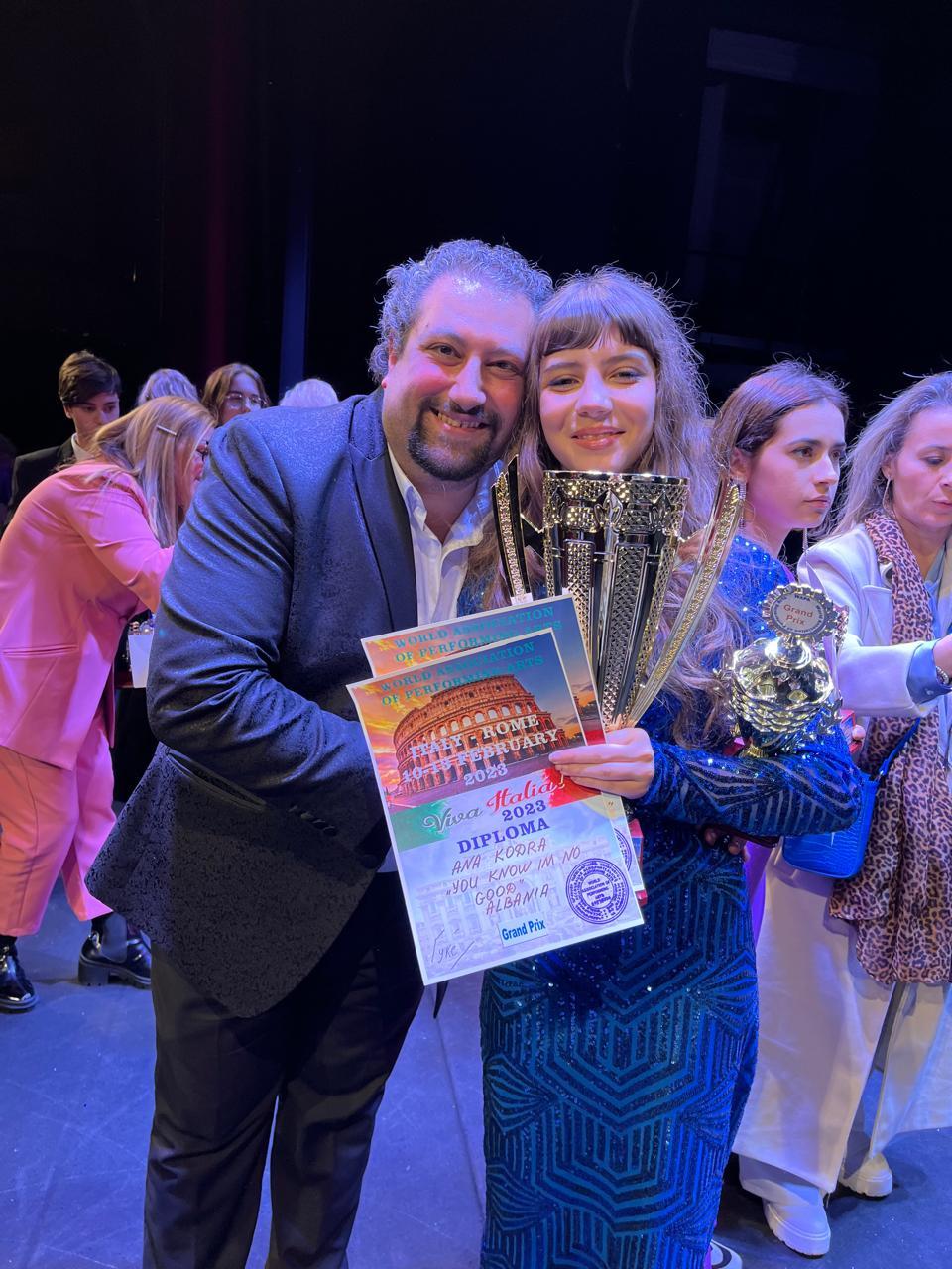 At the Viva Italia 2023 festival in Rome, Ana Kodra earned the Grand Prix, the event’s highest distinction. She was judged by an international panel led by Armando Ghukasyan (President of the Jury) and including Claudio D’Eboli (Italy), Marina O’Neill (Mexico), and Adam Barro (France)—a jury before whom Ana stood out for her vocal mastery and stage presence among participants from over 15 countries.