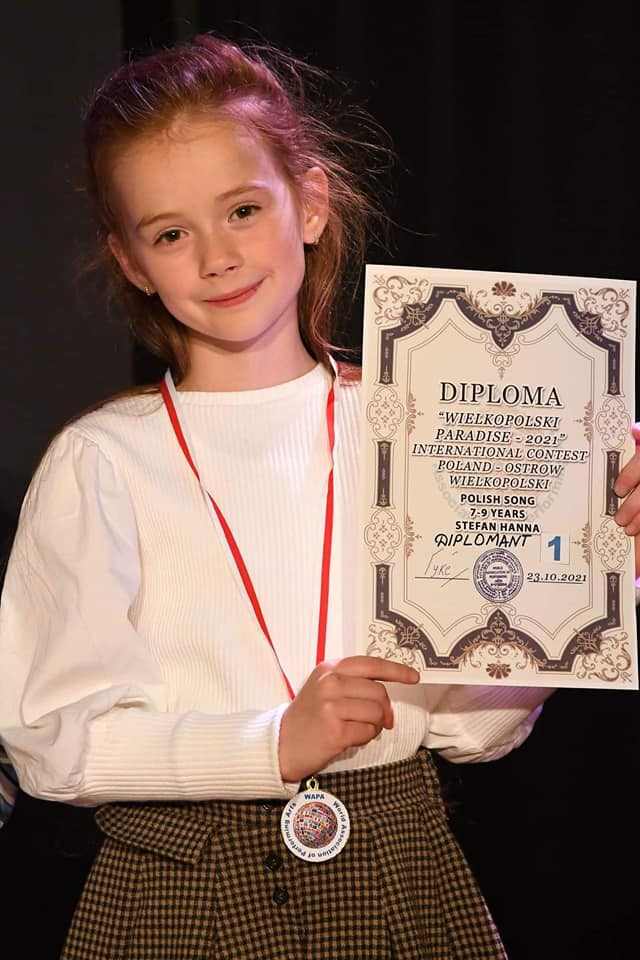 An international vocal showcase bringing young talents to the Polish stage. The 2021 edition featured solo and ensemble performances across age divisions, with live jury scoring and formal awards. In the Polish Song category (ages 7–9), Hanna Stefan earned 1st Place, receiving top marks for clear diction, musicality, and confident stage presence. A warm, theater-style production—with certificates, medals, and photo ceremonies—made this edition a memorable highlight for participants and families alike.