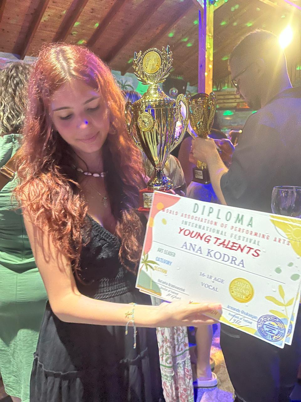At the Young Talents – Katerini 2024 international festival (June 24, 2024, Katerini, Greece), Ana Kodra won the event’s highest distinction, the Grand Prix. Organized by WAPA, the festival hosted young artists from 12 countries, and an international jury praised Ana’s vocal precision, emotional expression, and professional stage presence.